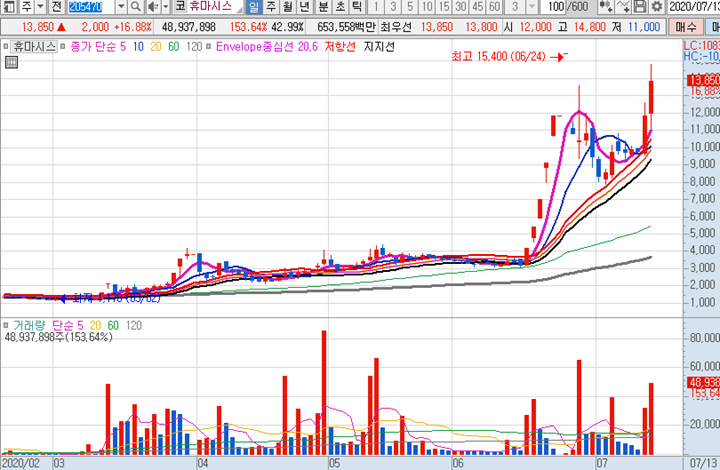 휴마시스 일봉차트 입니다. 일봉이 너무 공격적으로 보이지요? 여러 번 쩜상으로 주가를 올려놓고 조정이후 나시 그 가격이상으로 나왔으며 이제 6월24일 쩜상 가격인 15400원 돌파를 눈앞에 두고 있습니다.