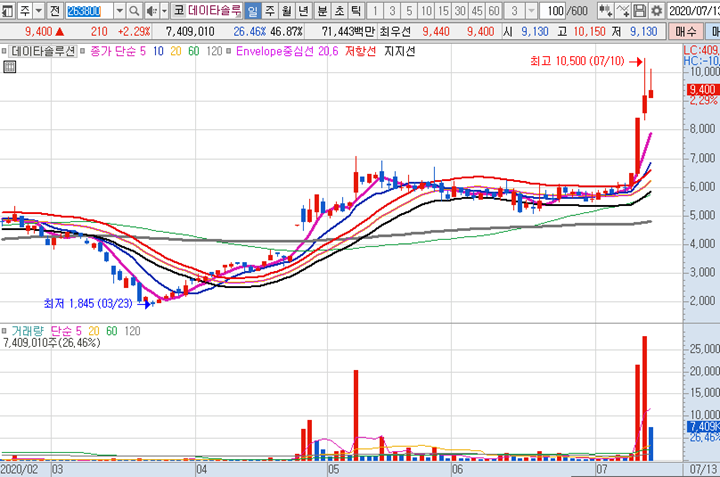 데이타솔루션 일봉차트 입니다. 7월 9일 상한가 진입이후에도 여전히 죽지 않고 있는 종목으로 금요일 종가배팅시에 크게 수익을 실현할 수 있었던 대박 종목이였습니다. 정부에서 추진하는 디지털뉴딜 정책과 관련하여 이슈가 있는 종목으로 요즘 주식시장에 핫한 종목입니다. 만약 조정이 나온다면 7~8000원까지 하락할 수 도있지만 그 매수타점에서 매수한다면 금방 다시 급등할 가능성이 많은 종목입니다.