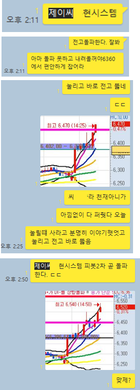 제이씨현시스템 3분봉 입니다. 2시11분에 공유한 종목으로 그 당시 바로 돌파 못하고 눌릴 때 매수하라고 이야기를 해줬었고 제 말대로 바로 전일고점돌파를 못하고 눌리고 있다가 10일선까지 하락직후 곧바로 다음 분봉부터 긴 양봉이 나오기 시작하여 피봇2차저항을 돌파하며 장종료전까지 지속적으로 상승한 종목입니다.