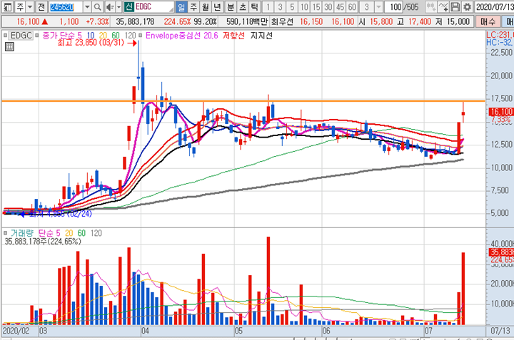 EDGC 일봉차트 입니다. 전일 상한가 달성이후에 오늘은 상한가 달성한날의 거래량이 2배이상이 터지면서 주식시장에 관심이 집중된 종목입니다. 위아래가 길로 몸통이 짧은 양봉캔들로 이번주에 좋은 시세를 줄 것 같은 종목입니다. 당일 매매시에 의미있는 거래량과 물량이 확인되고 매수타점이 오는 순간 또 진입할 것 입니다.