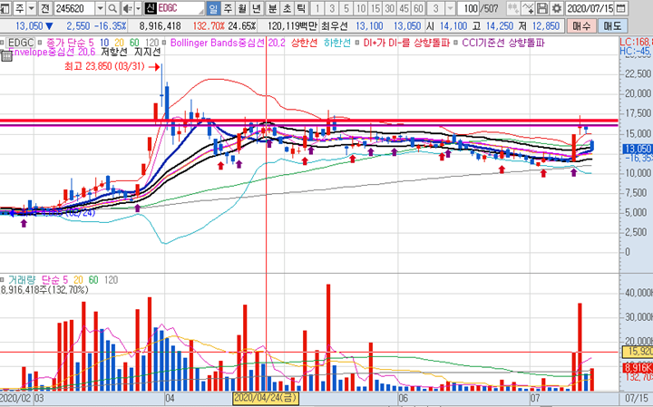 EDGC 일봉차트 입니다. 3일간 수익이 많이 나온 종목으로 오늘 갑작스러운 급락으로 많이들 놀라셨을 겁니다. 그러나 하한가를 가지 않았고 일봉상 위치로 봤을 땐 오히려 매수기회라고 보여집니다. 그 이유는 이러한 차트는 10일선 지지 관점으로 봣을 때는 다시 곧 바로 반등이 나올 가능성이 높이 때문입니다. 비록 급락을 했지만 당분간 다시 반등이 나오는지 지켜보도록 하겠습니다.