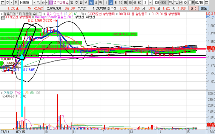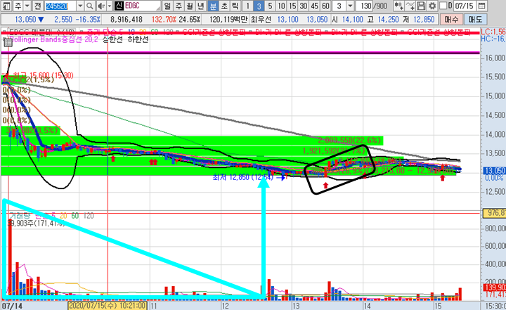 EDGC 3분봉 입니다. 몇일간 크게 시세가 나온 종목이였지만 오늘 아침에 급락으로 출발하면서 개미투자자를 공포에 질리게한 종목입니다. 이 종목은 점심시간때 잠시 짬이 나서 친구들이 하는 이야기에 힌트를 얻어서 최저점이라 생각하고 매수 한 것이 볼린저밴드 상단을 타면서 2%이상의 시세를 주었기에 수익으로 매도한 뜬금포 수익을 준 종목입니다.