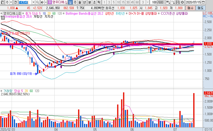 영우디에스 일봉차트 입니다. 일봉상 잠잠한 상황이였습니다. 오늘 장전에 이 종목을 선택하니 거래량이 꾀 많이 나오면서 오전장에 시세가 괜찮게 나온편이라 앞으로 추가적인 상승을 예측하고 있는 종목입니다.