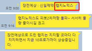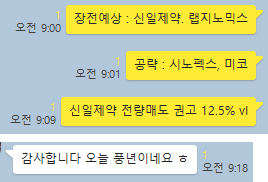 금요일 종가배팅의 경우 다음주 월요일 장 시작시 크게 먹는게 일상입니다. 이번에 매매한 종목 역시 시초가에 10%이상 급등이 나왔으며, 시초가에 선정한 예상 종목과 금일 공략종목 모두가 아무거나 매매해도 모두 수익이 날 만큼 좋은 종목을 상대했습니다. 그럼 오늘 매매에 대해 이해하기 쉽게 카카오톡 당시 대화내용과 차트를 보면서 설명 드리도록 하겠습니다.