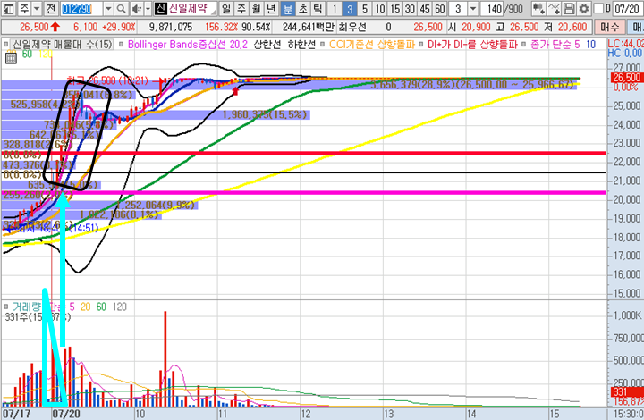 신일제약 일봉차트 입니다. 일봉차트를 보시면 오늘의 상한가로 인해 역대급 신고가가 달성된 종목으로 아마 내일도 공략할 가능성이 높은 종목이니 시초가에 유심히 지켜봐야할 종목입니다.