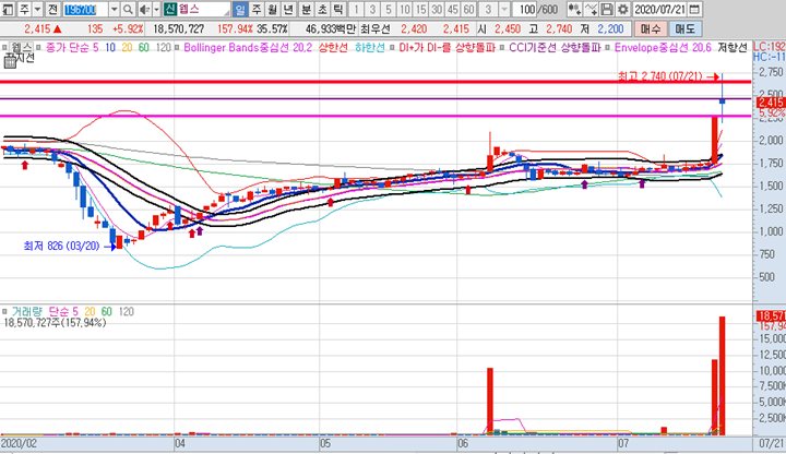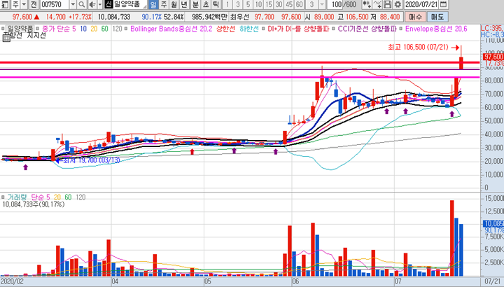 일양약품 일봉차트 입니다. 오늘의 급등시세로 인해 역대급 신고가가 달성된 종목입니다. 적지만 기관수급이 계속 유입되고있으며 지금 일봉차트 위치는 다소 위험한 자리지만 요즘에는 상승 방향으로 틀은 종목위주로 더 큰 시세가 자꾸 나오기 때문에 함부로 예측하기는 어렵습니다.