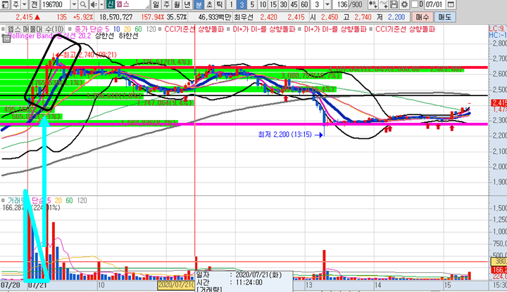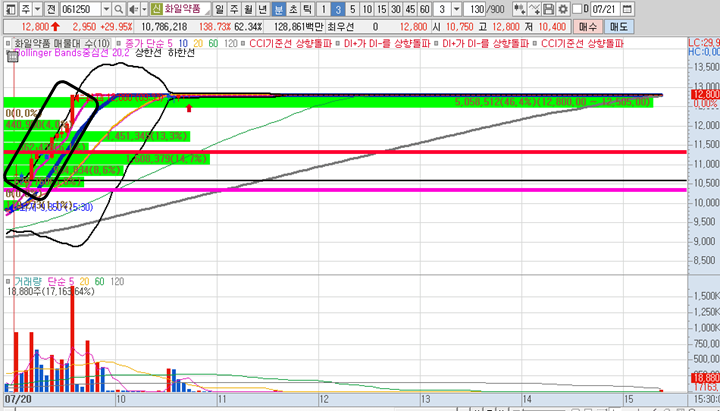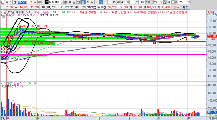 일양약품 3분봉 입니다. 장초반에 피봇2차저항이 돌파되면서 24분동안 급등하며 28.5%까지 상승을 하였지만 상한가에 진입하지 못하고 무너진 모습이였습니다. 오후장에 120일선을 지지하니 갑자기 급등이 나오면서 다시한번 수익을 실현할 구간이 있었습니다.