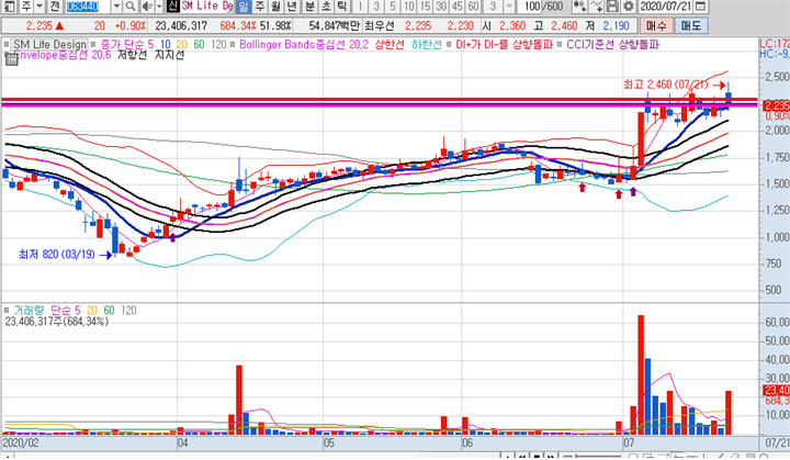 sm life design 일봉차트 입니다. 상한가 진입이후에 주가가 10일선을 꾸준하게 유지하면서 다시 서서히 거래량이 붙으면서 언젠가 다시 급등이 나올 것 같은 종목입니다.
