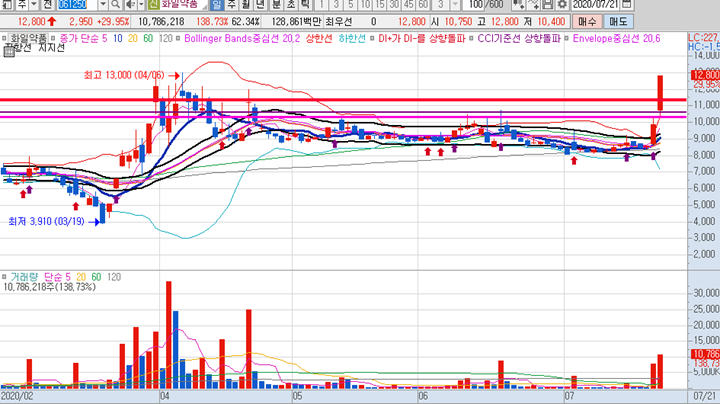 화일약품 일봉차트 입니다. 오늘 상한가에 진입하고 그 가격을 깨지않고 장마감까지 유지되었기 때문에 굉장히 강력하다는 것을 알 수 있습니다. 내일 시초가에도 다시 진입할만한 유력한 종목으로 시초가 돌파 계획을 세워서 접근하도록 하겠습니다. 내일 최근 최고점인 13000원을 돌파할 가능성이 매우 높기 때문에 이제 그 가격위에서 거래될 것 이라보면서 새로운 가격대가 형성될 것 입니다.