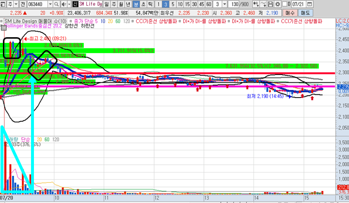 sm life design 3분봉 입니다. 오늘 매매 종목중에 유일하게 1프로대 손절을 한 종목입니다. 시초가 돌파를 하는 것으로 알고 들어갔는데, 약 수익이였지만 그 다음 분봉이 음봉으로 내려오며 뭔가 심상치 않은 분위기여서 일단 매도하였습니다. 그 이후에 항상 매매하는 타점인 눌림목 구간에서 매수하여 깔끔하게 복수혈전에 성공한 종목입니다.
