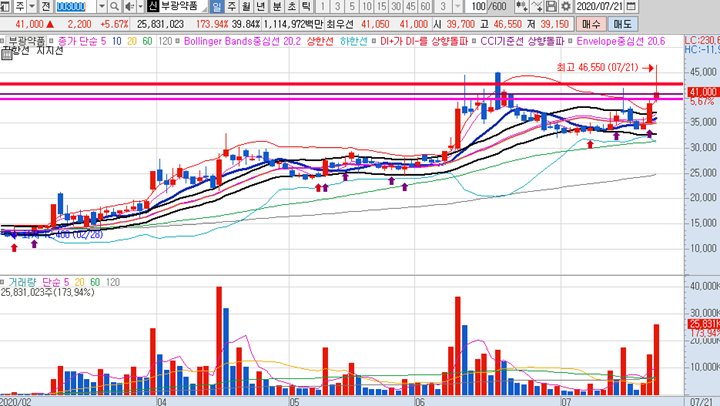 부광약품 일봉차트 입니다. 시초가 급등가격을 지켜주지 못하고 지속적으로 밀리면서 긴 윗꼬리가 달린 양봉으로 마감되었습니다. 아직도 외국인 수급이 남아있기 때문에 오늘 최고점 부근을 다시 뚫어주기 위해 노력할 것으로 보입니다.