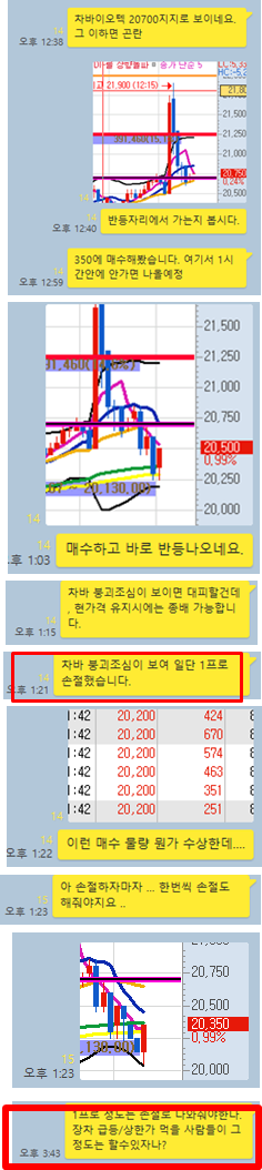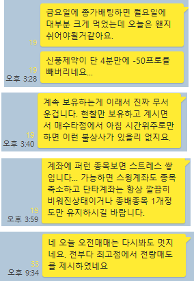 그럼 오후장 매매에 대해 이해하기 쉽게 카카오톡 당시 대화내용과 차트를 보면서 설명 드리도록 하겠습니다.