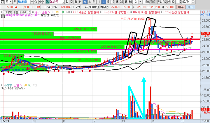 노바텍 일봉차트 입니다. 지속적으로 상승하는 정배열 차트로 오늘 오후장에도 강한 거래량으로 최고가를 달성했으며 최근 최고점인 27200원을 조만간 돌파할 것으로 보입니다.