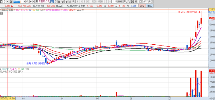 프럼파스트 일봉차트 입니다. 요즘 지속적인 거래량이 터지면서 상승분위기에 있는 이 종목은 오늘의 급등시세로 인해 결국 역대급 신고가를 돌파하였습니다.