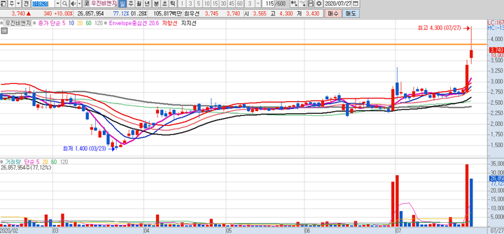우진비앤지 일봉차트 입니다. 오늘의 급등 시세로 인해 역대급 신고가를 달성한 종목입니다.