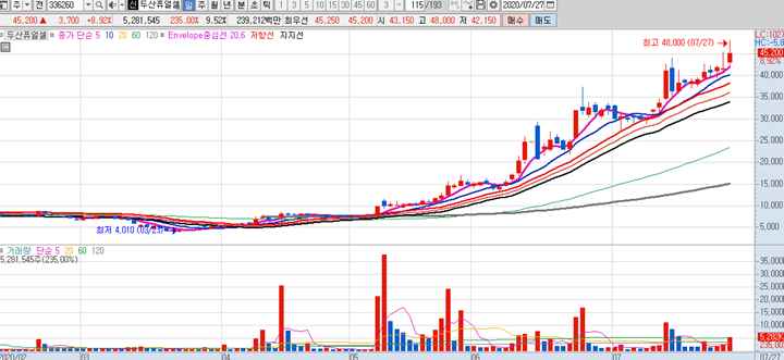 두산퓨얼셀 일봉차트 입니다. 오늘의 급등으로 인해 역대급 신고가를 달성한 종목입니다.