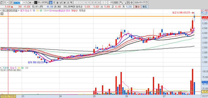 유니온머티리얼 일봉차트 입니다. 오늘의 급등시세로 역대급 신고가가 나온 종목입니다.