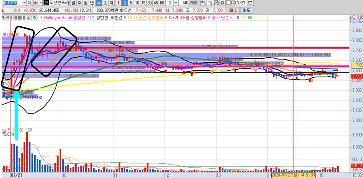 두산인프라코어 3분봉 입니다. 장 시작전 급등 예상종목으로 미리 선별해놓은 종목으로 계획대로 긴 양봉으로 갭 상승이 나오고 난뒤 주저않고 지속적으로 상승하며 장중 최대 8%이상 급등이 나온 종목입니다. 그 이후 지지하는 이동평균선에서 매수하여 추가적인 수익도 가능했던 종목입니다.