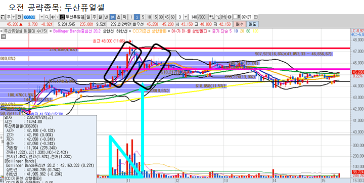 두산퓨얼셀 3분봉 입니다. 첫번째 네모박스에서 전일고점돌파에서 피봇2차저항을 예상하고 그 이후에 두번째 네모박스에서 정확하게 지지하는 상황을 보고 눌림목매매는 45450원으로 매수타점을 제시하였으며, 그 당시 망설이는 친구를 위해 “전재산 털어서 사면된다"라고 까지 이야기를 해준 종목인데, 제가 제시한 타점에서 무난하게 3%이상의 수익을 실현할 수 있었던 종목입니다.