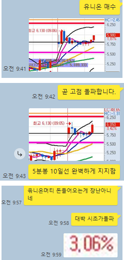 금요일 장막판 제약주 급락등의 이상현상으로 인해 종가배팅없이 차분하게 맞이한 오늘 주식장은 공략종목 3개중에 2개나 상한가에 진입하는 놀라운 성과를 달성하였습니다. 공략종목이 거짓말인지 아닌지는 그 당시에 실제 카카오톡 대화내용에 기록된 시간을 보시면서 확인하시면 되겠습니다.