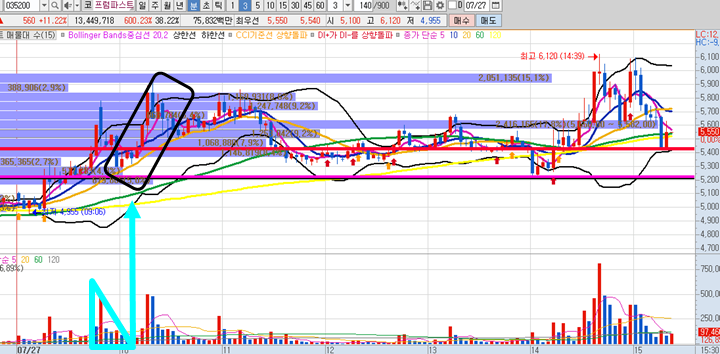 프럼파스트 3분봉 입니다. 프럼파스트는 최근 매매를 하고자 기회를 호시탐탐 노리고 있었던 종목으로 오늘 전일고점 돌파이후 첫눌림 공략을 성공한 종목입니다. 제시한 5310원 타점에서 12%가까운 괜찮은 수익률이 나왔습니다.