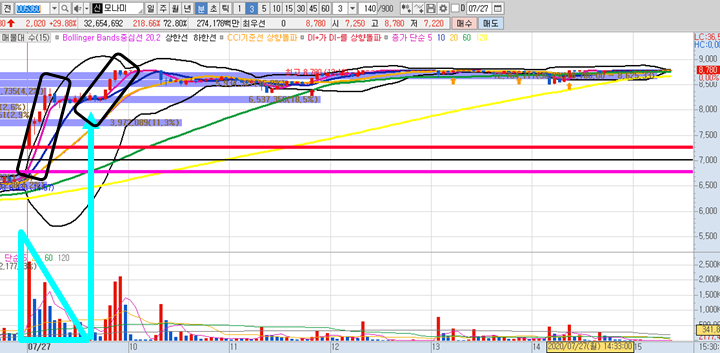 모나미 일봉차트 입니다. 제가 공략하는 일봉차트의 공통점으로는 신고가 및 정배열된 차트입니다. 오늘 모나미 차트의 경우도 정배열된 예쁜 모습에서 상한가가 나온 종목입니다.