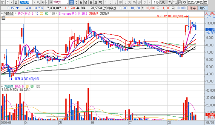 YBM넷 일봉차트 입니다. 시초가에 상승이후 지속적으로 하락하며 5일선이 무너진 상태로 9600원대까지 하락이후 다시 반등을 기대할만한 종목입니다.