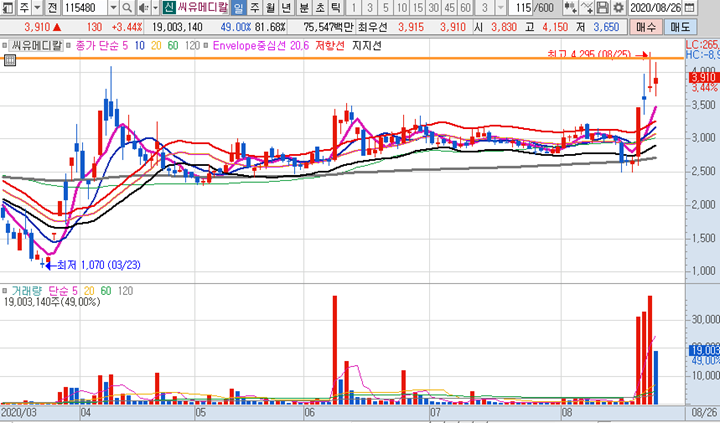씨유메디칼 일봉차트 입니다. 상한가 진입이후에도 여전히 살아있는 종목으로 주로 아침시간에 활발하게 움직이고 있습니다. 아마 내일도 한번더 시세가 나올만한 일봉차트로 보입니다.