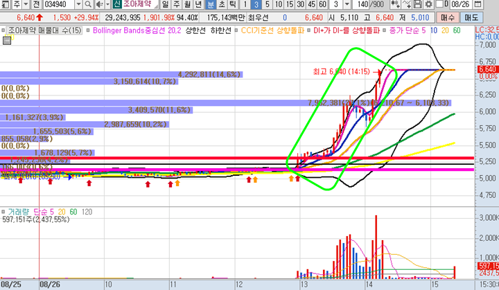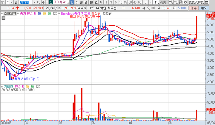 조아제약 일봉차트 입니다. 오늘 상한가 진입 직행이후 풀리지도 않았으며 내일 시초가에도 갭상승이 예약된 종목입니다.