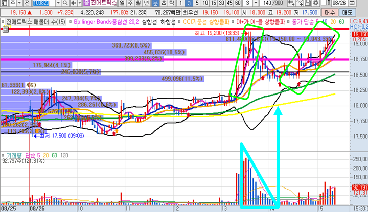 진매트릭스 일봉차트 입니다. 오늘 오후의 급등시세로 인해 일봉이 매우 좋아진 상태입니다. 다시 최고점인 25800원을 뚫기위한 노력으로 보여집니다.