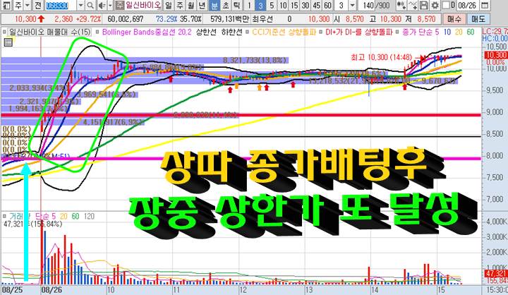 일신바이오 일봉차트 입니다. 4거래일전 10일선을 지지한 이후에 연속적인 급등이 나오고 있는 일신바이오 입니다. 제가 5천원대에서 공유한 종목이 2배이상의 가격이 되어버렸습니다.