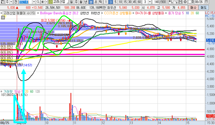 고려산업 3분봉 입니다. 추가적으로 공력하고자 선별한 종목으로 시초가 돌파를 강력하게 해주면서 바로 VI에 진입을 하였습니다. 그러나 그이후 일시적인 조정이나왔으며 지지하는 구간에서 모두 반등이 나오면서 결국 당일 고점을 돌파하면서 주가가 최대 26%가까이 상승을 하였습니다.