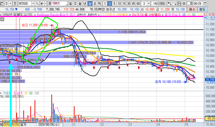 씨유메디칼 3분봉 입니다. 3일 연속으로 공략한 종목으로 오늘은 장시작 예상종목으로 미리 선별해두었습니다. 장시작후 9분간 하락이 있긴했지만 볼린저밴드 하단 지지후 1시간동안 주가가 상승하면서 9%이상까지 수익구간이 나왔습니다.