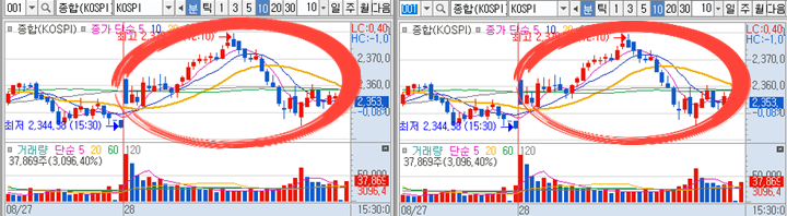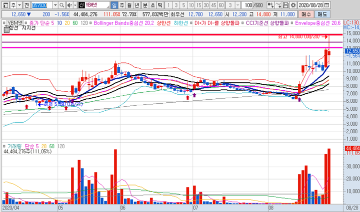 YBM넷 일봉차트 입니다. 오전장에 급락이 나왔지만 일봉상 5,10일 이동평균선은 절대 깨지않고 지지하며 하루안에 다시 큰 급등이 바로 나왔습니다. 만약 보유종목이 급락을 하고 있다면 반드시 일봉상 지지하는 이동평균선 구간을 확인하시면서 더 큰 물량으로 추가매수를 해두면서 평균단가를 낮추는 것도 좋은 방법 입니다.