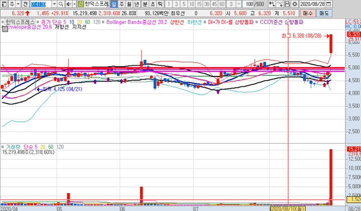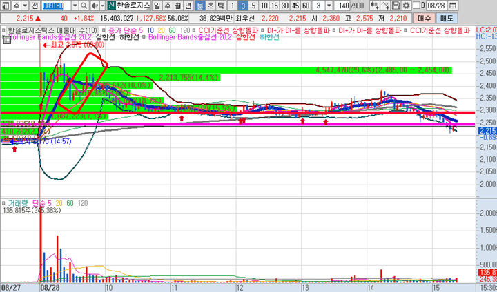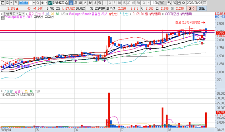 한솔로지스틱스 일봉차트 입니다. 오늘 급등으로 인해 장중 신고가를 돌파하기도했지만 오후장에 급락이 나오면서 긴 윘고리가 달린 음봉으로 마감되었습니다.