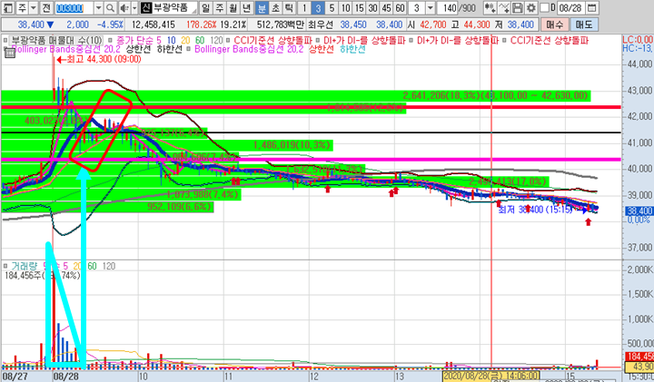 부광약품 일봉차트 입니다. 정배열된 일봉차트에서 역시 수익낼 수 있는 구간이있었습니다. 비록 종가가 최저점으로 마감되었지만 큰 욕심을 부리지 않고 원칙대로 매매에 임했다면 수익을 챙길 수 있는 종목입니다.