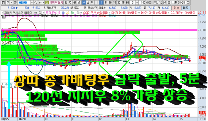 제이씨현시스템 3분봉 입니다. 어제 상따 종배를 시도한 종목으로 장막판에 상한가가 풀리면서 불길한 예감이있었는데 역시나 개장직후 급락으로 시작하였습니다. 상한가 마감이 되었다면 장 종료시까지 풀리지 않아야 다음날 높은 확률로 급등이 나오게 되는 것 입니다. 위 차트는 3분봉 차트지만 5분봉차트로 봤을 때 정확하게 120일선을 지지하면서 그 자리에서 8%이상의 수익이 나왔습니다. 그 당시 10시23분에 영혼까지 끌어모아 매수(영끌 매수)를 언급하며 정확한 매수 타점을 제시하였습니다.
