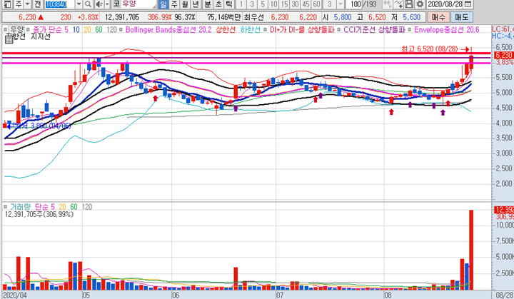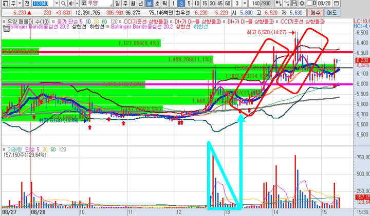 우양 일봉차트 입니다. 일봉상 정배열된 상태로 오늘의 급등으로 인해 신고가 달성되었습니다. 차트가 너무 좋기때문에 다음주도 시초가 상황이 좋을 때 한번더 매매할 기회가 있으리라 봅니다.