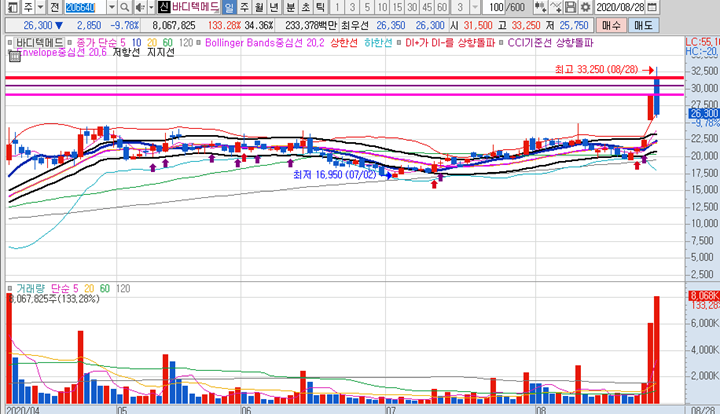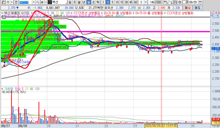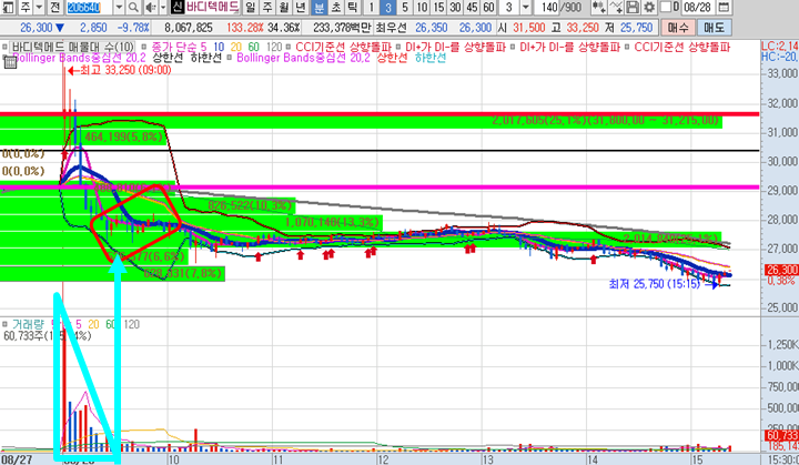 바디텍메드 3분봉 입니다. 이 종목은 첫번째 캔들이 이미 14%이상 급등이 나온 종목으로 두번째 캔들을 봤을때 그 높은 곳에 전혀 근처도 가지 못하고 하락이 나왔습니다. (앞서 소개드린 상한가 종목 한익스프레스와 다른 점이 한익스프레스는 18%이상 급등캔들이지만 2번째 캔들이 그 고점마저 뚫어주며 상한가에 진입했다는 명백한 차이점이 있습니다.)그래서 시초가 돌파매매로 적합하지 않았기에 탈락 처리하고 그 시간에 일단 다른 종목을 매매하기 위해 추가적인 종목을 발굴해냈으며 20일선마저 깨부수면서 볼린저밴드 최하단까지 뚫으며 불린저밴드의 형태가 변형되며 하락이 잠시 멈추고 올라오는 시기가 일시적으로 있기는 했습니다.(삼각형 및 화살표 부근)