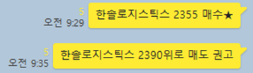 한솔로지스틱스 3분봉 입니다. 추가적으로 공유한 종목으로 눌림목매매를 위해 2355매수가격을 제시하였고, 6분만에 2390원 위로 매도를 권고하였으며 단기적으로 최대 2455원까지 상승하며 4.2%가까운 수익 구간이 있었습니다.