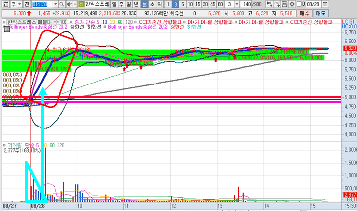 한익스프레스 3분봉 입니다. 첫번째 캔들이 이미 18%이상 급등으로 출발하였음에도 불구하고 두번째 캔들이 첫번째 캔들의 최고점을 돌파할 정도로 강력한 종목입니다. 결국 장 시작한지 18분만에 상한가에 진입한 강력한 종목입니다. 잠시 상한가가 풀리기는 했지만 10일선을 지지하면서 다시금 상한가에 진입하였습니다.