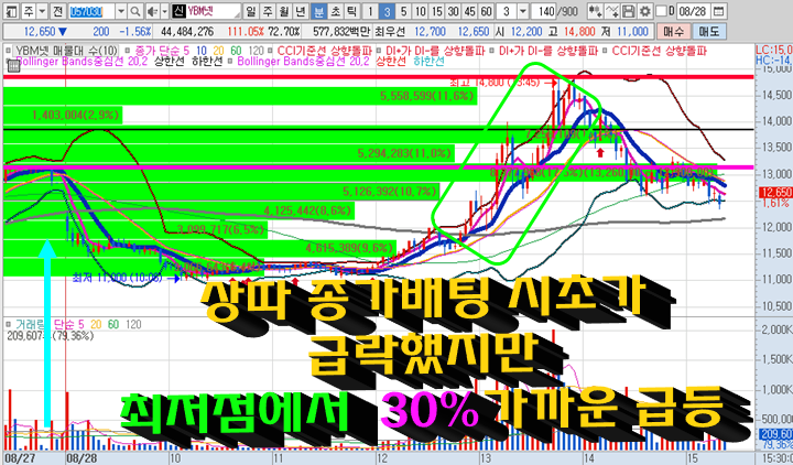 YBM넷3분봉 입니다. 어제 장종료전 상한가 진입 하는 것을 보고 상한가 따라잡기를 시도한 종목으로 시초가에 갭상승을 기대했지만 오히려 큰 폭으로 주가가 하락한 상태로 시작하였습니다. 그러나 볼린저밴드 하단 지지이후 캔들이 볼린저밴드 상부를 올라타더니 점심시간 이후부터 급격한 상승이 나오다가 급기야 최저점에서 최대 30% 가까운 급등이 나온 논란의 종목입니다. 피봇1차저항인 13850원 매도를 권장하였지만 정확하게 피봇2차저항인 14800원까지 급등이 나온이후 다시 급락이 나왔습니다.