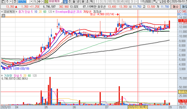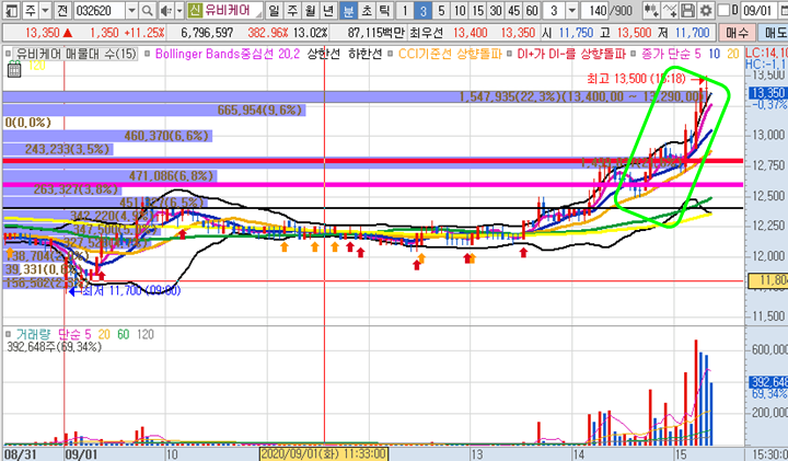 유비케어 3분봉 입니다. 부방장 추천종목으로 오후장에 20일선 지지후 장종료시까지 지속적인 급등이 나온 종목입니다.