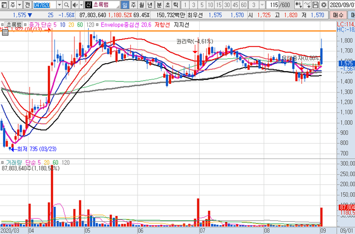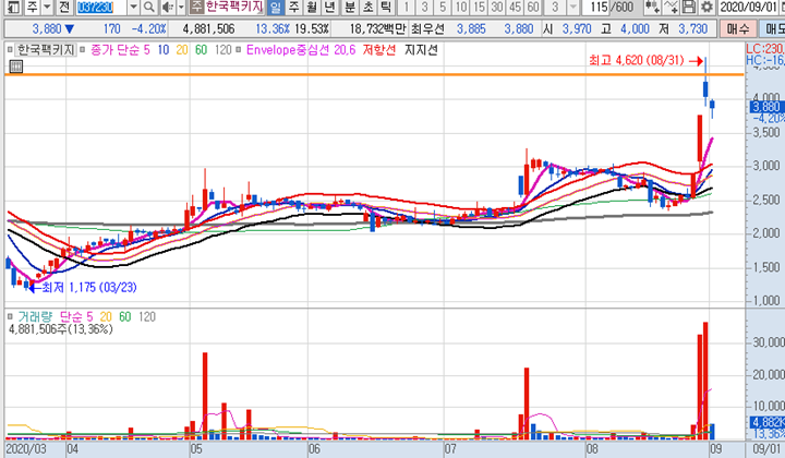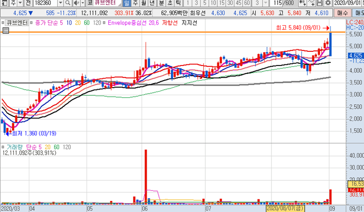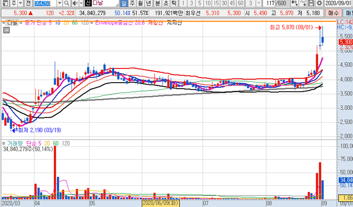 다날 일봉차트 입니다. 카카오게임즈 일반공모와 관련하여 지분을 일부 보유하고 있는 다날이 어제에 이어 오늘도 시초가에 큰 급등이 나왔습니다. 시초가에 큰 급등시세로 역대급신고가를 달성하였지만 10시이후로 주가가 무너지면서 긴윗꼬리가 달린 음봉으로 최종마감되었습니다.