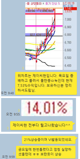 제이씨현시스템 3분봉 입니다. 목요일 종배와 금요일 추매를 한 상태로 일부물량을 남겨둔 종목으로 오늘 오전에 급등이 나오면서 장중 최대 24%이상의 급등이있었습니다. 저는 14%의 수익을 최종적으로 실현하였으며, 점심특선으로 다시 재매수 가격을 7690원, 7640원으로 각각 제시하며 2차매수 자리에서는 3%이상의 수익구간이 12분만에 나왔던 종목입니다.