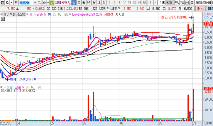 제이씨현시스템 일봉차트 입니다. 전형적인 N자형 패턴으로 목요일 종가에 상한가에 진입하지 못하고 금요일에 급락이 온상태로 2일간 눌림을 주다가 5일선을 찍으면서 정확한 반등이 나오면서 오늘의 24%까지 큰 급등시세가 나왔습니다. 지난주 목요일 종가배팅후 금요일 시초가에 급락했을때만 하더라도 초상집 분위기였는데, 그 당시 120일선에서 정확히추가매수했던것이 유효한 추가매수 타점으로 그 당시 5%가량 수익을 실현하고 남은 물량을 다음주까지 홀딩하면 다시 급등이 나올 것이라 확신했는데 생각보다 너무 빨리 급등이 나와서 물량을 전량 정리하였습니다. 제이씨현시스템은 오늘의 급등으로 역대급 신고가 가격이 달성되었습니다.