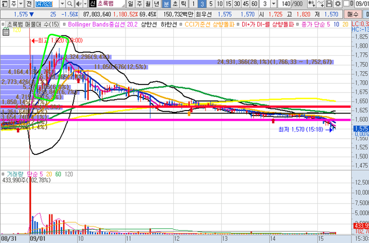 초록뱀 일봉차트 입니다. 시초가 갭상승이후 급격히 하락하였지만 지지선에서 곧장 반등이나오며 수익수간을 충분히 준 종목으로 역시 아침시간에 강한 흐름을 보였으나 시간이 갈수록 주가가 점점 하락하며 종가가 최저가로 끝나버린 종목입니다.