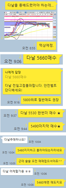 다날 3분봉 입니다. 9시6분에 5660원에 매수가를 제시한이후 전일고점 돌파후 5870원까지 9분안에 약 3.7%수익이 바로 나왔습니다. 절반매도 권장후 나머지 물량홀딩후 10시부근 황금선 지지를 실패하자 나머지 물량은 손절로 정리하며 수익이 가능했던 종목입니다. 개인적으로는 깔끔하게 전일고점에 모든 물량을 정리했으면 어떠했을까 후회를 합니다.