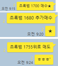 초록뱀 3분봉 입니다. 1700원과 1680원 2번에 나눠 분할매수한 종목으로 1680원 2차 매수 직후 주가가 최대 1795원까지 급등하며 약 7%가까운 상승을 보였습니다. 적당히 1755원 위로 매도하라는 이야기를 보고 매도 하였을 경우 대략 챙길 수 있었던 수익은 5% 가량 됩니다.