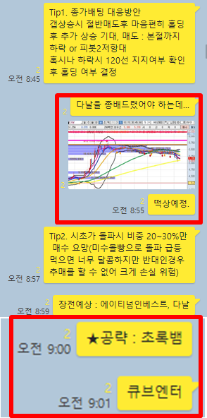 오늘 장전예상 종목 2개와, 공략종목 2개를 선정하였습니다. 전체 4개 종목중 3개 종목을 시초가에 공략하여 모두 성공을 하였습니다. 그러나 전일에 종가배팅한 종목이 예상대로 움직이지 않아 추가매수를 하여 겨우 수익으로 나오는 어려움도 있었습니다. 그리고 목요일에 종가배팅하고 금요일에 크게 물린상태로 추가매수했던 제이씨현시스템이 오늘 장중 최대 24%이상 급등이 나오면서 손실폭을 전부다 매꾸고 14%수익을 실현하고, 눌림목에서도 다시 잡아 수익으로 나왔습니다. 그럼 전체적인 매매타점에 대해 카카오톡 대화내용과 차트를 보면서 자세히 설명 드리겠습니다.